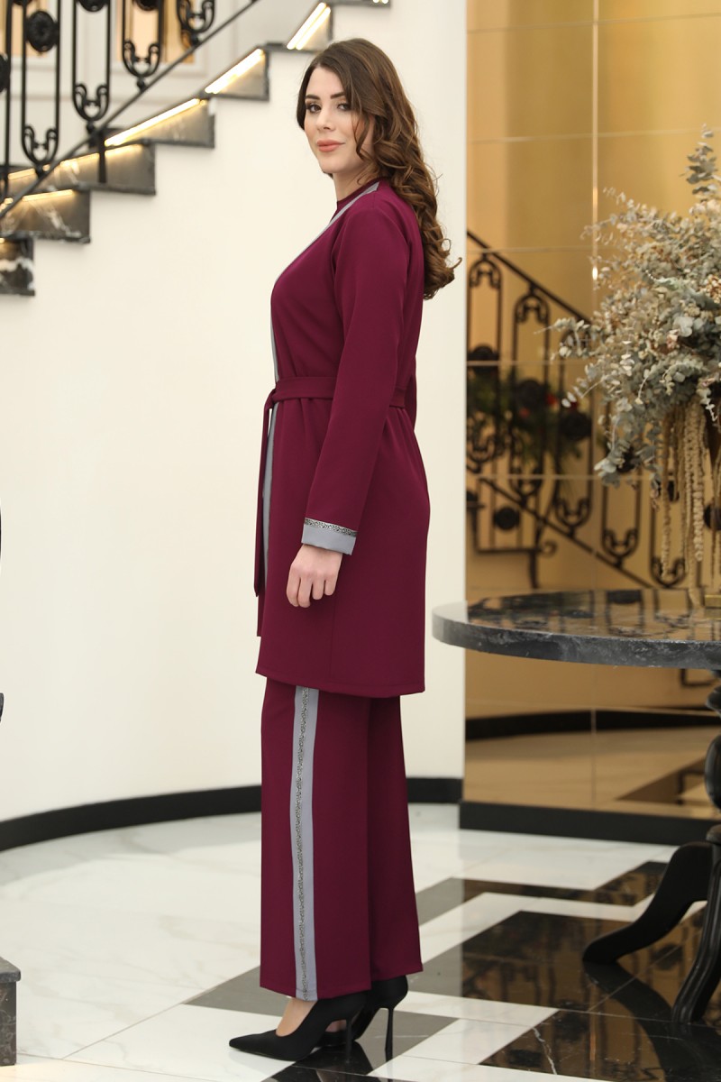 Havin Tesettür Ceket - Pantolon - Bluz 3LÜ Takım - Mürdüm