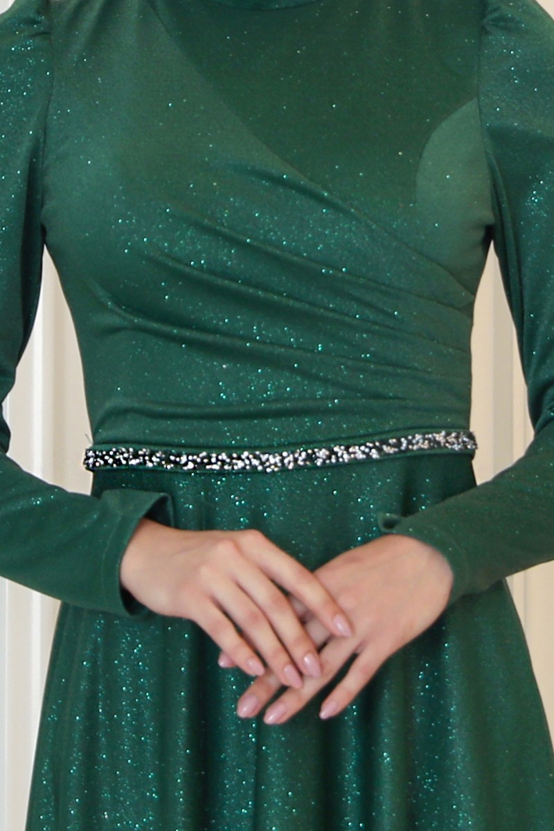 Simli parıltılı simli tül kumaştan üretilmiştir. Belinde taş kemer detayı bulunmaktadır. Kalıplarımız tam bedendir ve kullandığınız bedeni almanız uygundur. Beden konusunda beden tablomuza bakarak doğru bedeni sipariş verebilirsiniz.